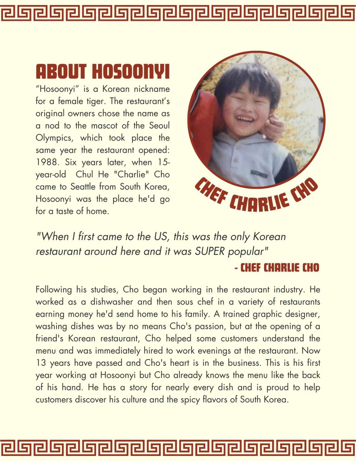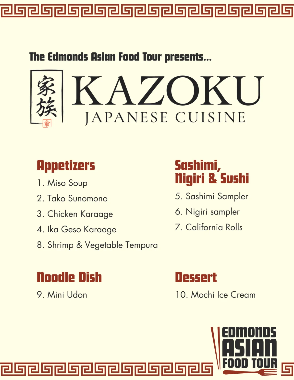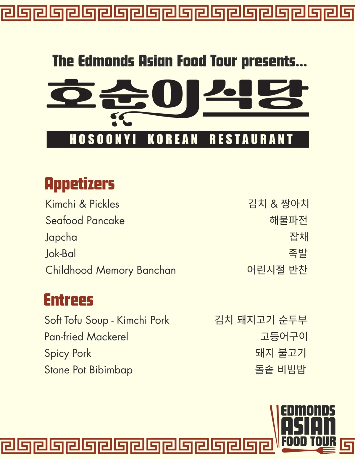 Edmonds Food Tours handles the content, design, and printing of custom souvenir menus for guests. On the frontside is the list of items that will be served and highlighted during the tour, and on the back is a heartfelt retelling of the chef or restaurant owner's story.