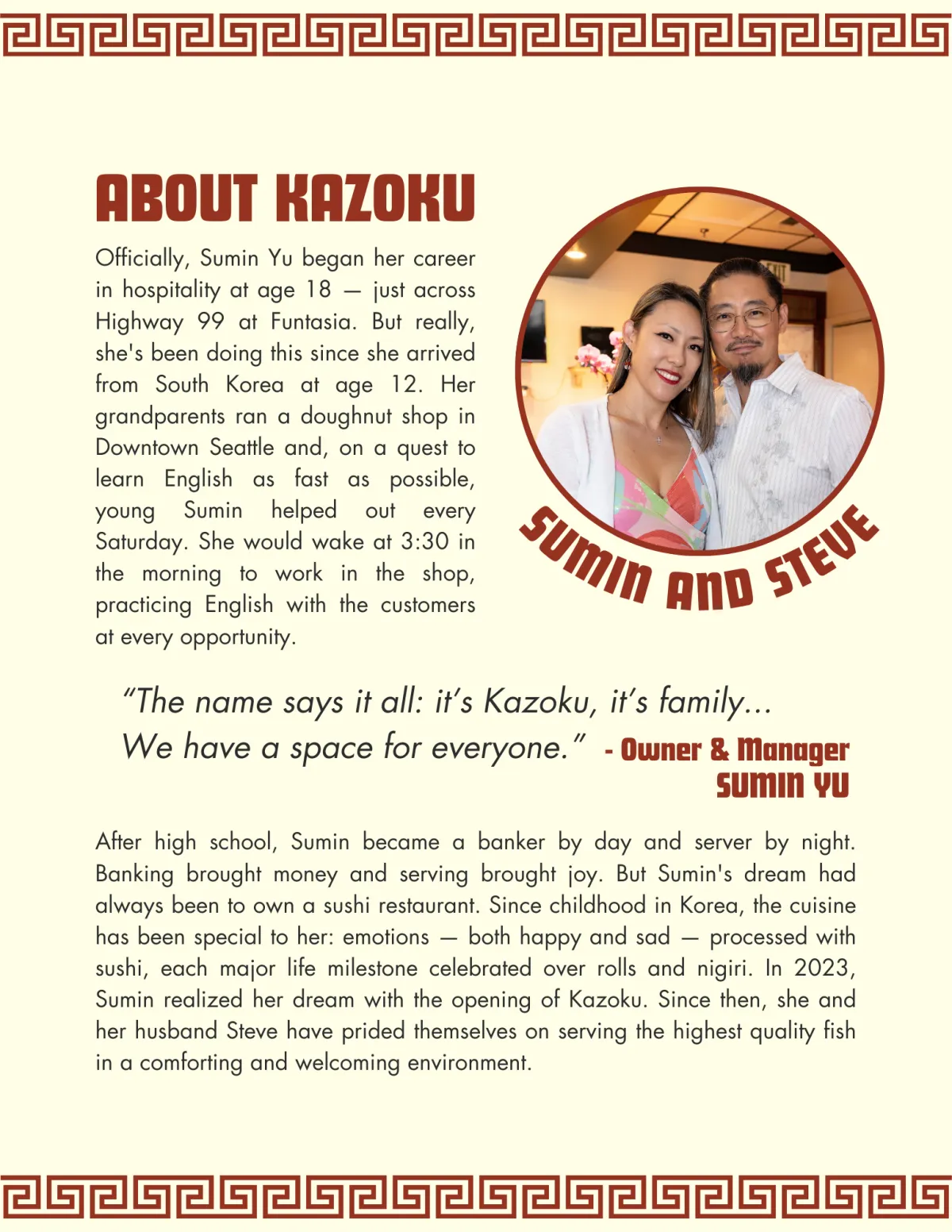 For years, Sumin Yu dreamed of having her own sushi restaurant. In 2023 that dream became a reality with the opening of Kazoku. Pull off Highway 99, step into Kazoku and let the restaurant transport you.